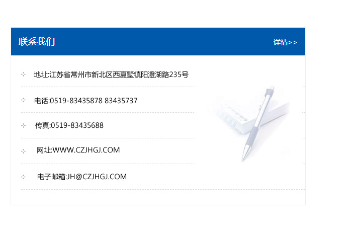 地址:常州市新北區友邦商務大廈1幢16、17層  電話:0519-85101652  傳真:0519-85112595  郵編:213022  網址:www_cz-jiayue_cn.jiahaovip.com  郵箱:xiajifengaa@163.com